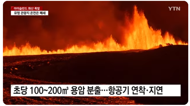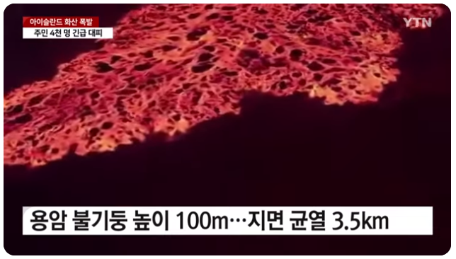 아이슬란드 기상청은 이날 레이캬네스 반도에 위치한 도시 그린다비크에서 4km 떨어진 지점에서 화산이 폭발해 초당 약 100~200㎥의 용암이 흘러나왔고 폭발로 인해 생긴 지면 균열은 약 3.5km로 측정됩니다.