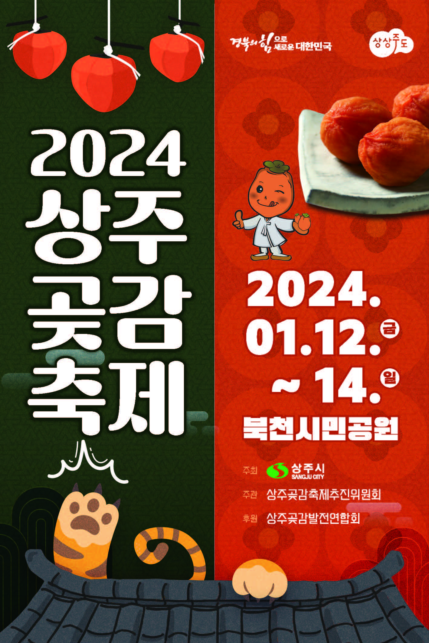 2024112일 금요일부터 14일 일요일까지 3일간 상주시 북천 시민공원에서 '2024 상주 곶감축제'가 열립니다. 이번 축제의 주제는 '역사상 최고(GOAT)'이며, 상주 곶감의 우수성을 강조합니다. 주요 프로그램으로는 개막식, 공연, 상주 곶감 노래 경연대회 등이 있으며, 다양한 부스와 체험 활동도 마련되어 있습니다.시간되시는 분들은 가족들과 참여해 즐거운 주말 보내시길 바랍니다.