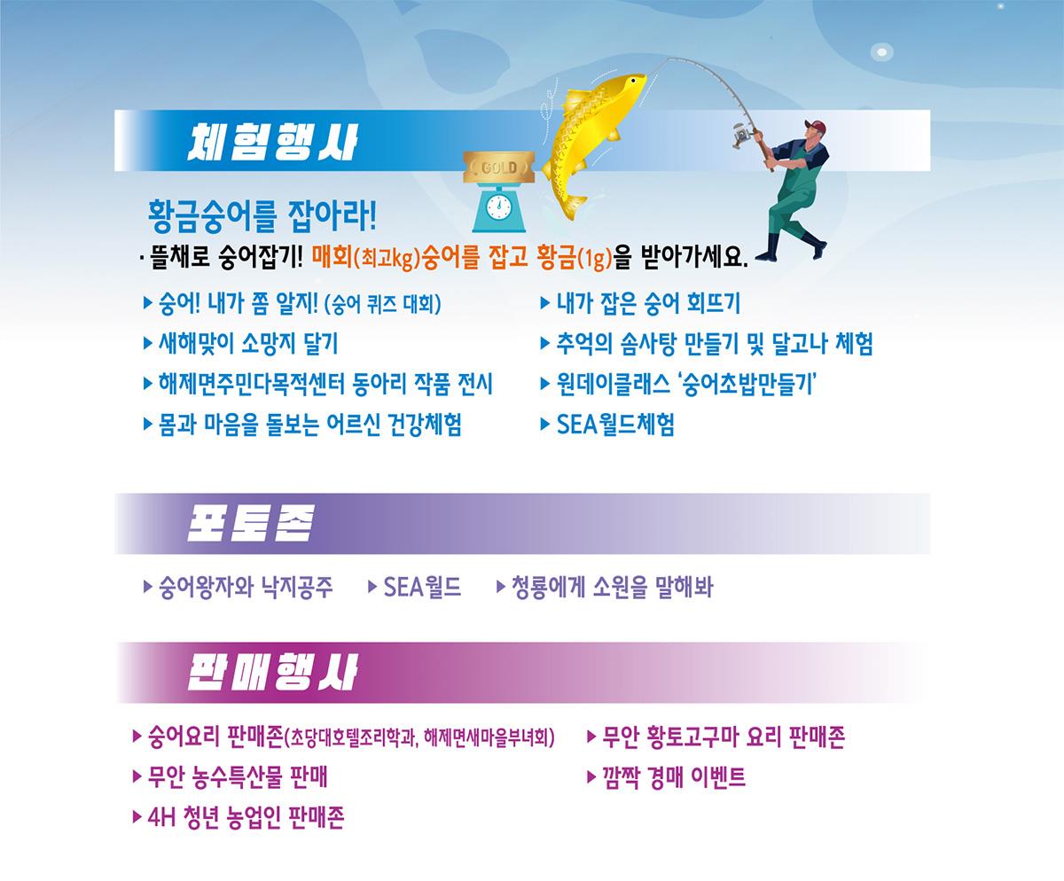 숭어 낚시 체험: 이 축제의 메인이벤트는 숭어 낚시입니다. 참가자들은 직접 바다에서 숭어를 낚아볼 수 있으며, 낚은 숭어는 현장에서 바로 요리해 맛볼 수 있습니다.